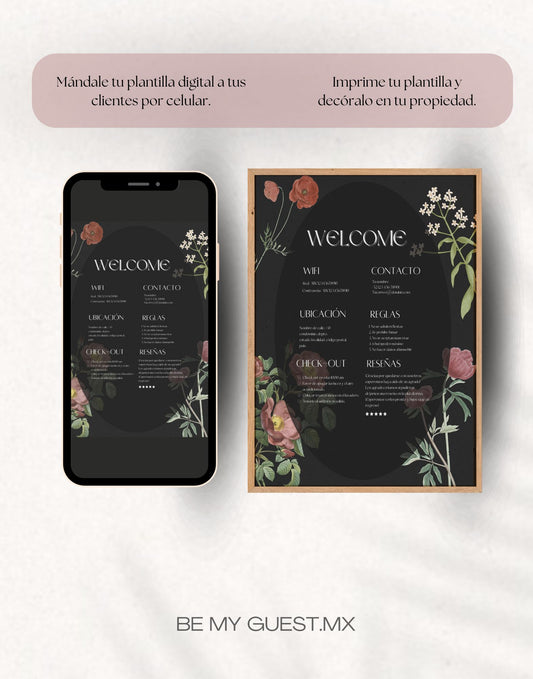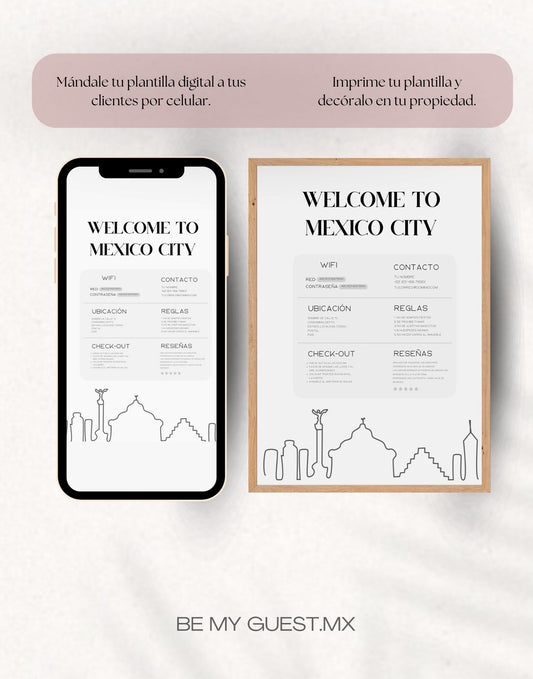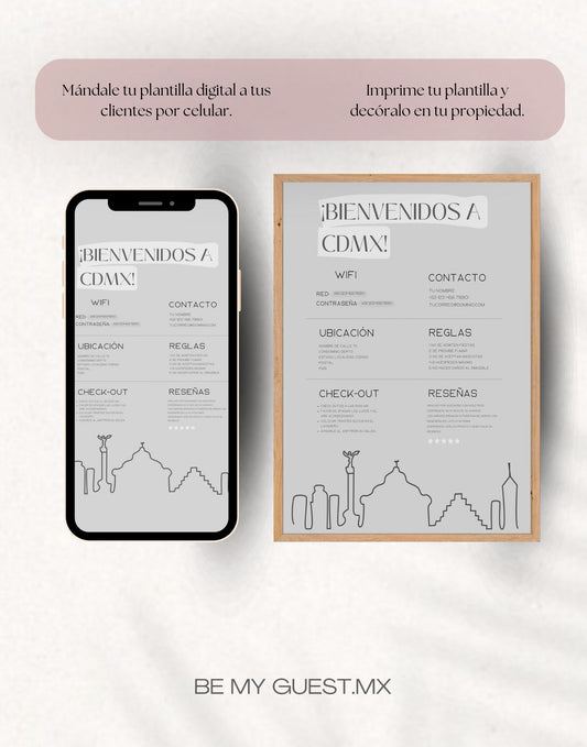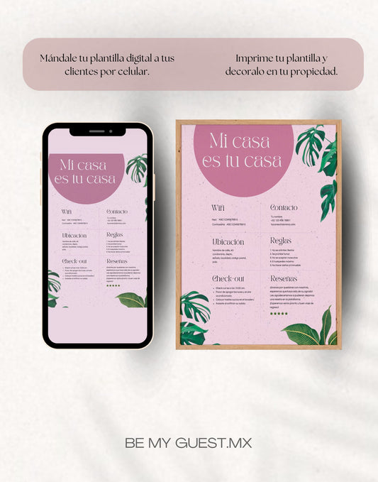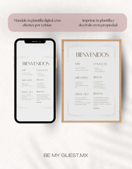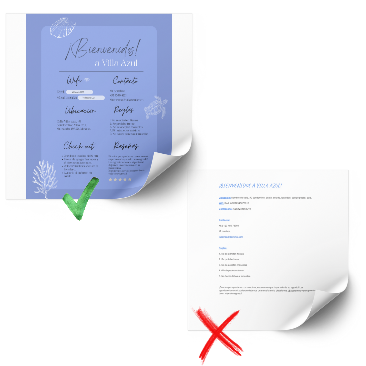 La presentación adecuada es clave en la experiencia de tus huéspedes. Desde detalles como el WiFi hasta las reglas de la casa. Nuestras plantillas editables están diseñadas para asegurar que tus clientes reciban una presentación profesional y completa incluso en sus dispositivos móviles.