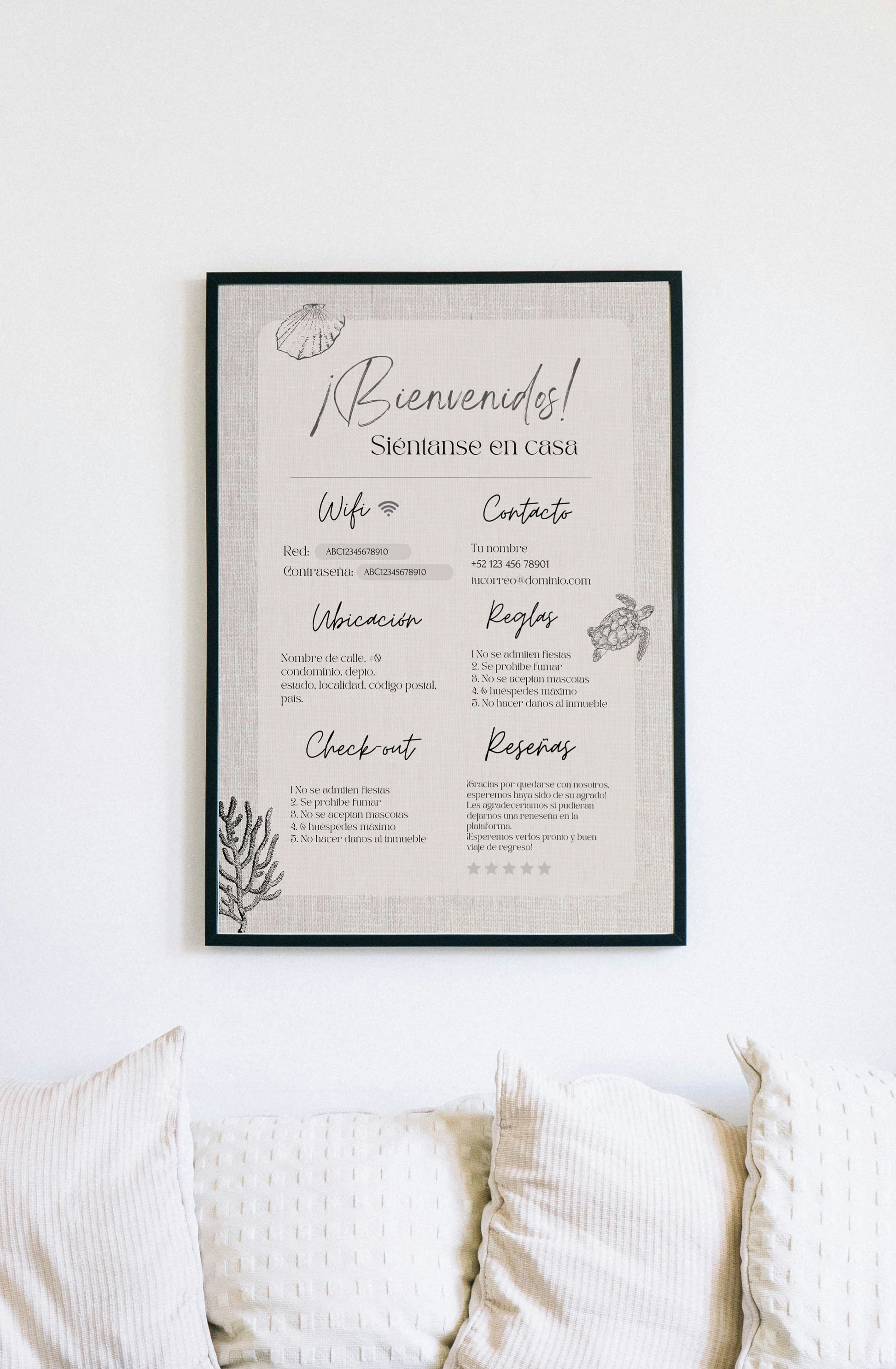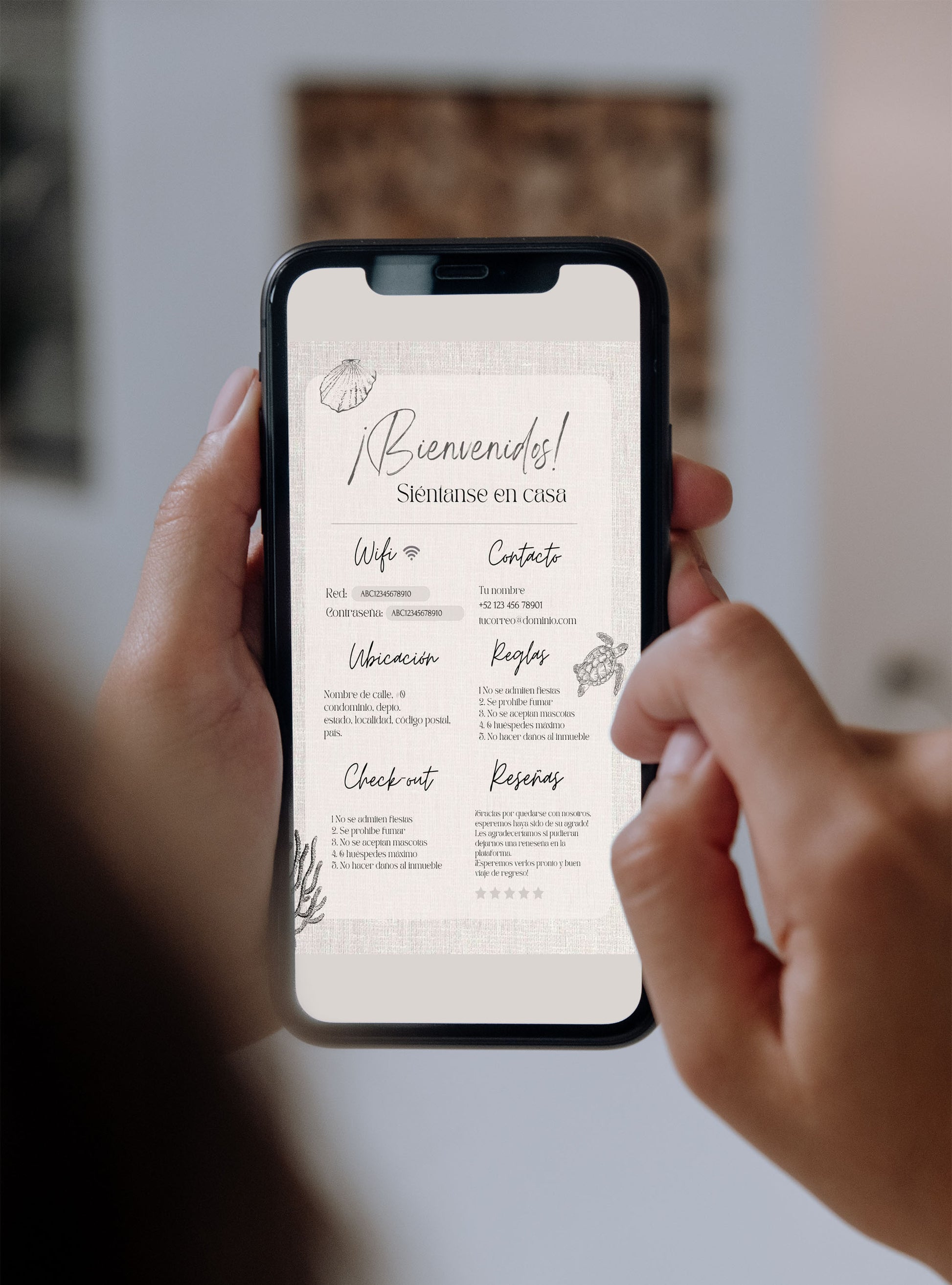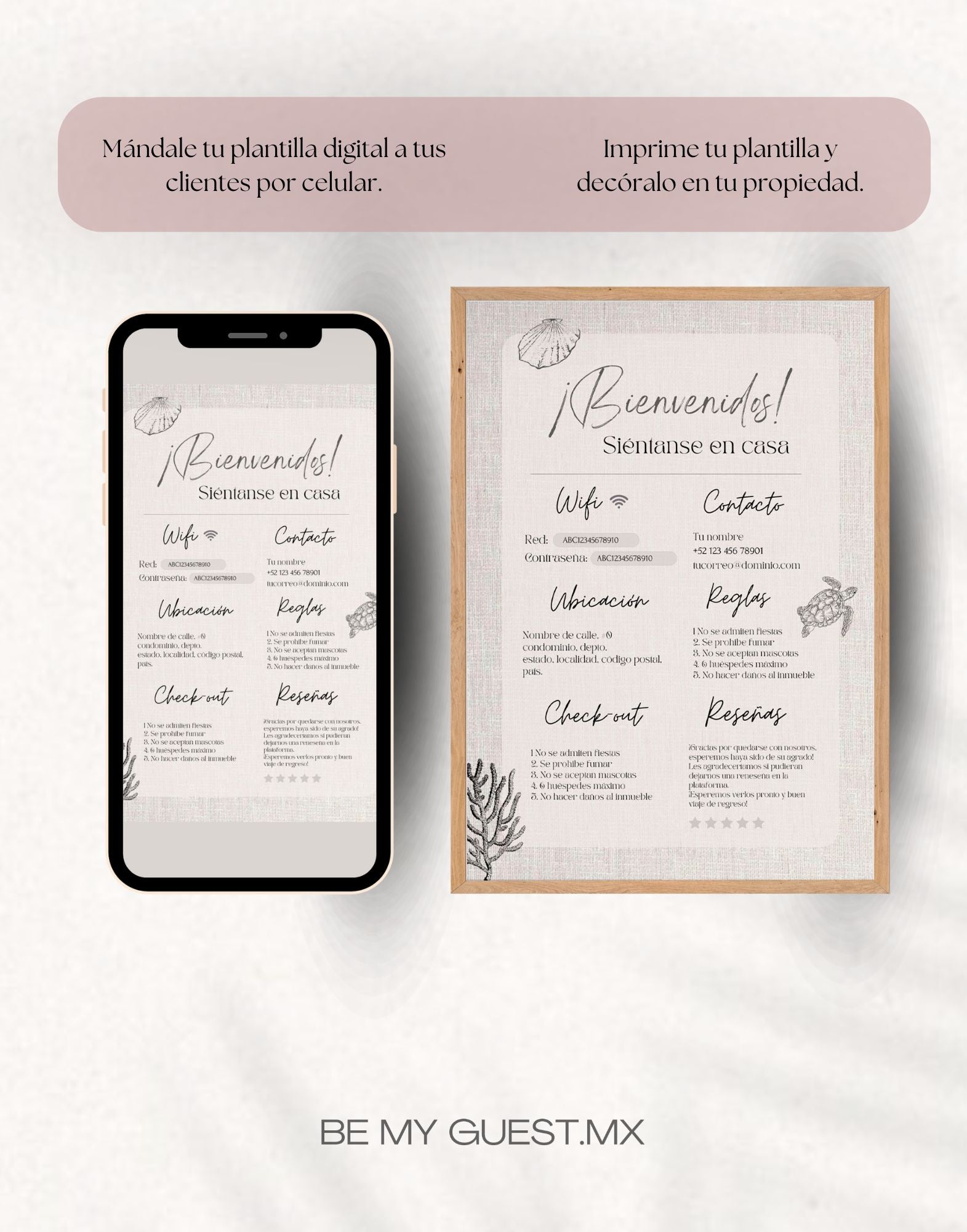 3. Versatilidad de Uso: Una vez editada la plantilla, se puede enviar digitalmente a tus clientes a través de su teléfono móvil o puedes imprimir la plantilla para tener una versión física que puede ser utilizada como decoración informativa en tu propiedad.