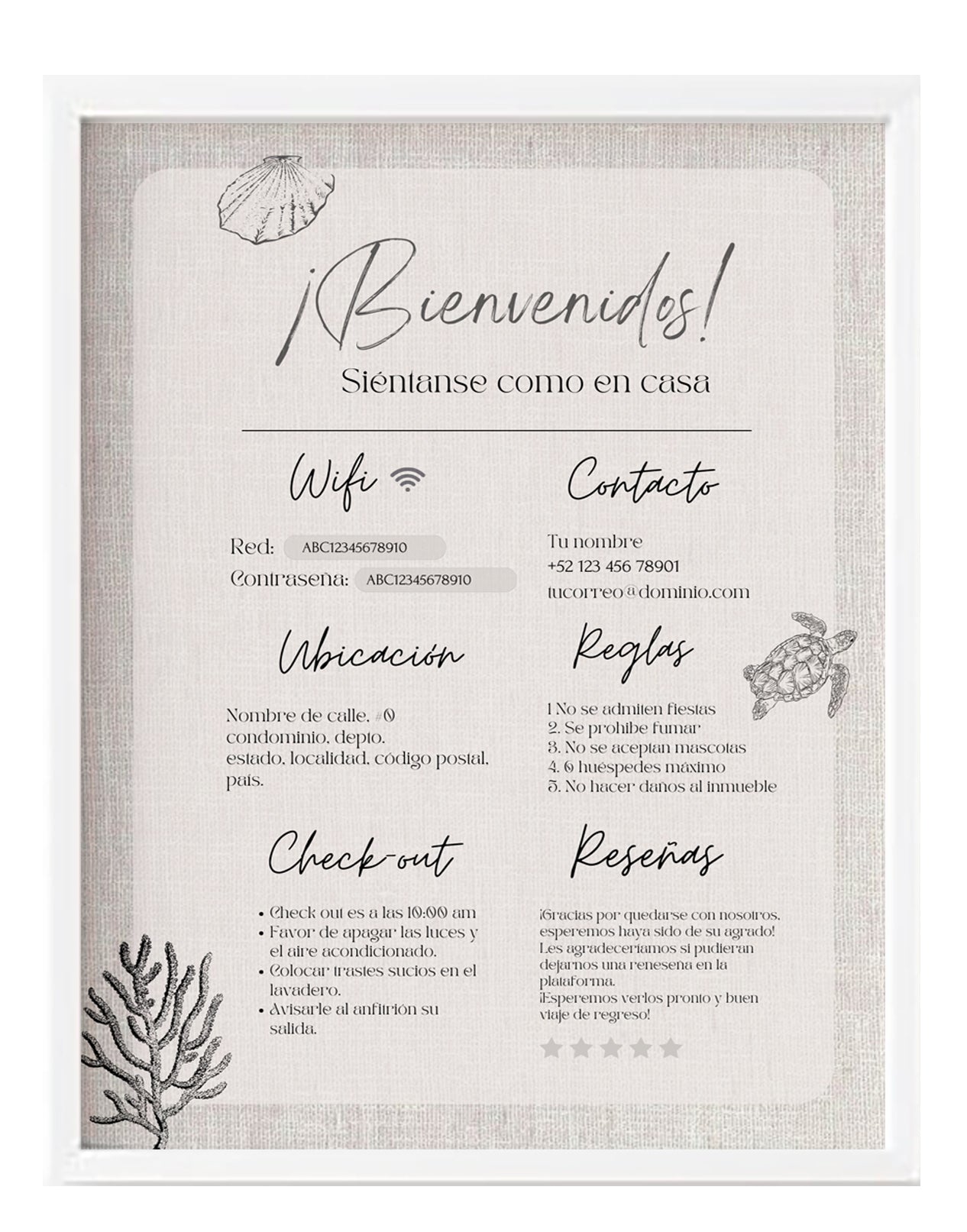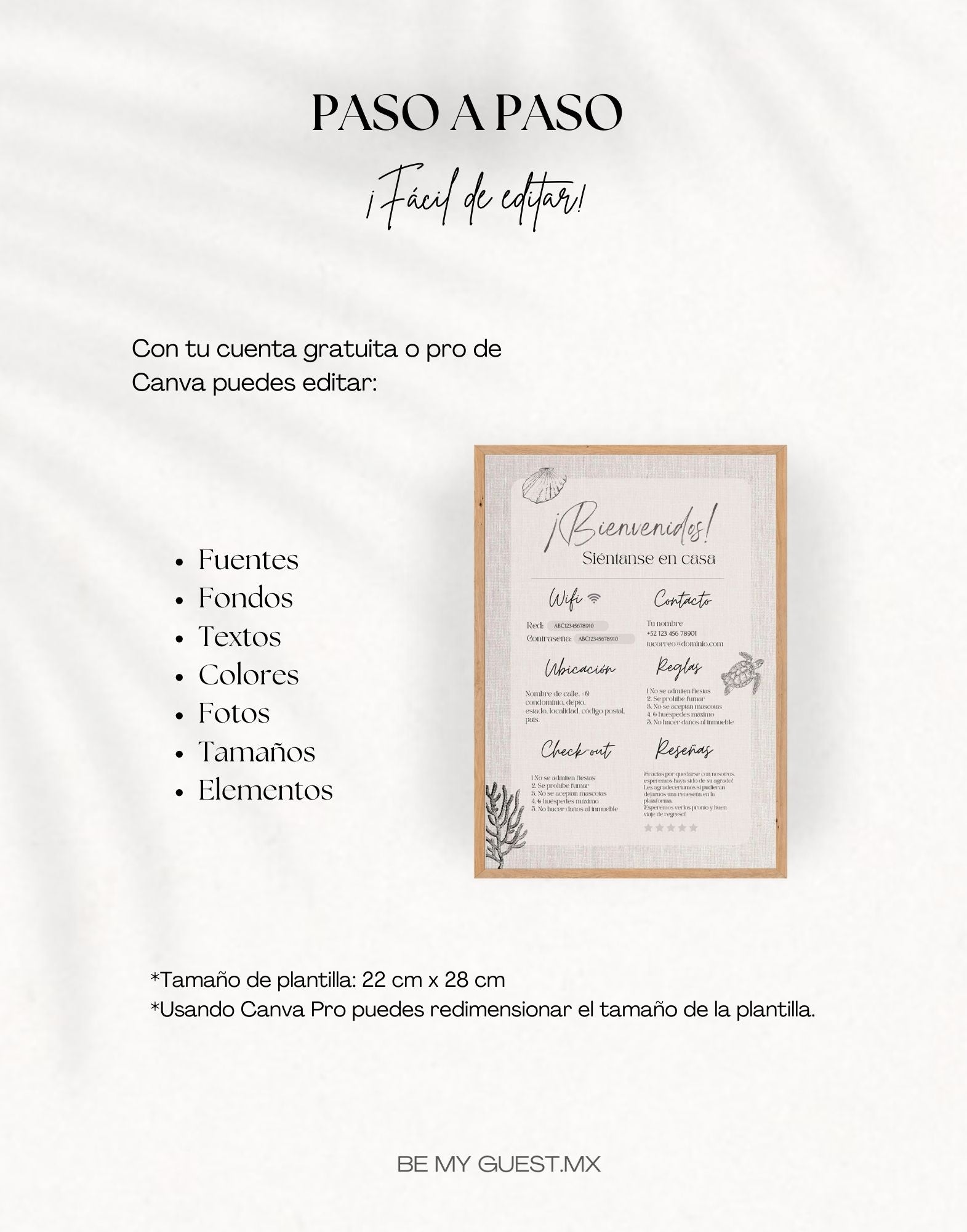 1. Editable y Personalizable: Personaliza fácilmente la plantilla con la información específica de tu propiedad (contacto, wifi, reglas, etc.) De igual manera puedes modificar los colores, textos, fuentes, elementos, etc.