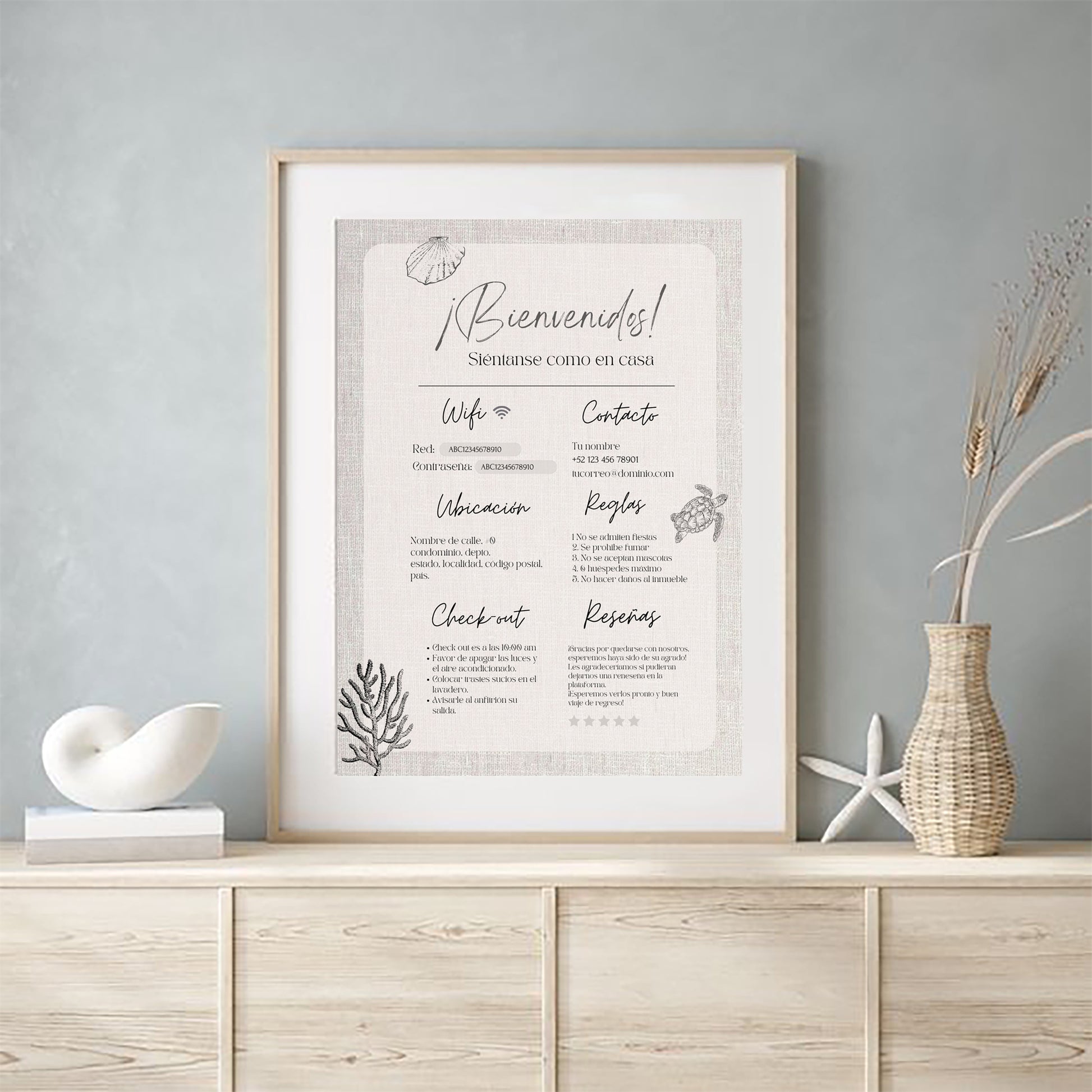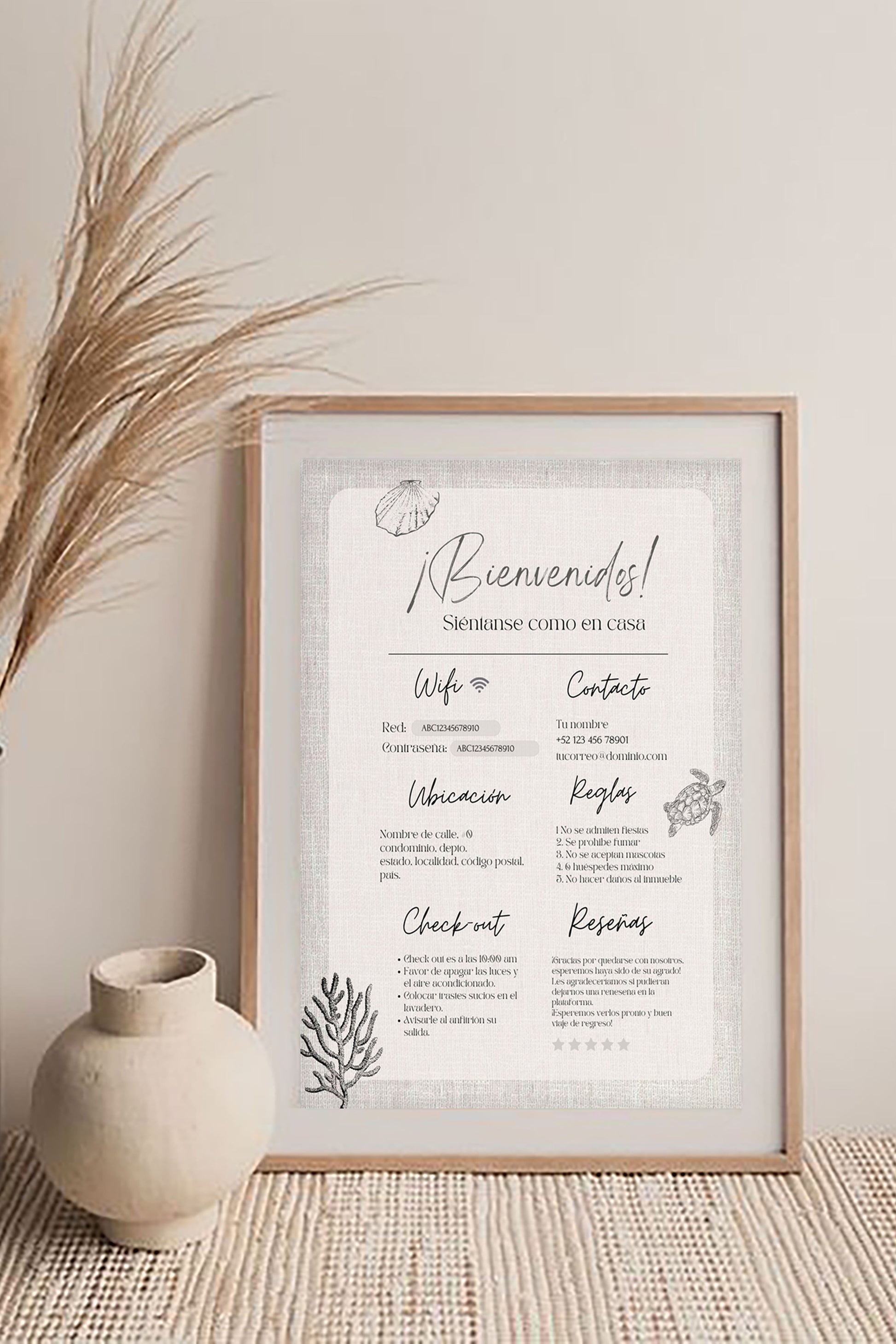 Esta plantilla está diseñada para asegurar que tus clientes tengan acceso a toda la información básica y necesaria, mejorando su experiencia y permitiéndoles disfrutar plenamente de su estancia. Simplifica la comunicación y agrega un toque profesional a tu propiedad con nuestra plantilla editable y personalizable.